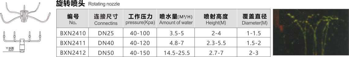 特點(diǎn):旋轉(zhuǎn)蟹爪蘭噴頭又稱風(fēng)水車.噴頭利用水流的噴射力作推動(dòng),使噴頭與水面成45度旋轉(zhuǎn),形狀似蟹爪.內(nèi)有聚四氟乙烯襯套,耐磨使用長(zhǎng).噴頭安裝與水面傾斜45度.專利號(hào):ZL201020231228.9