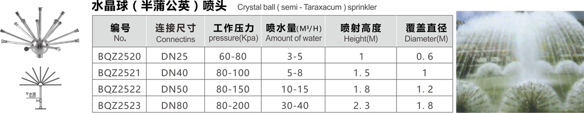 特點(diǎn):噴水時(shí)在陽(yáng)光照射下,酷似水晶寶石,球體停噴時(shí)造型似蒲公英,獨(dú)立或組合成景,銀光閃閃,氣勢(shì)壯觀。對(duì)水質(zhì)要求高,必須裝濾網(wǎng)。燈光效果好。