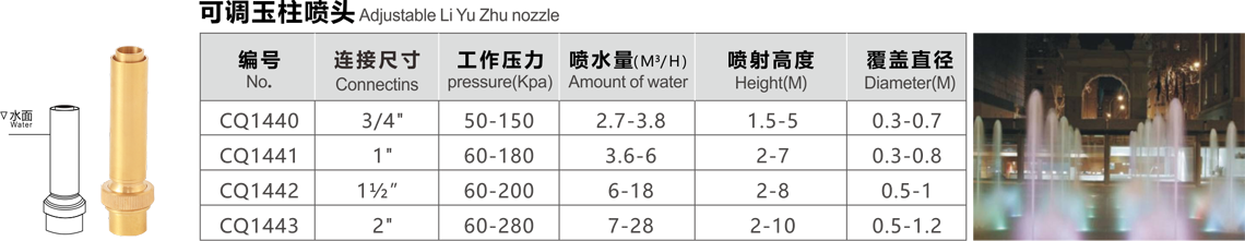 特點(diǎn):這種噴頭系列用射流泵的原理,噴水時將空氣吸入,以少量的水產(chǎn)生豐滿的射流,噴出水柱呈白色不透明狀,反光效果好,調(diào)節(jié)外套的高度可以改變吸入的空氣量,吸入的空氣越多,水柱的顏色越白,泡沫越細(xì)。噴頭有球形接頭,可繞中心線軸向15度轉(zhuǎn)動,它適用于室內(nèi)外的各種噴水池中。