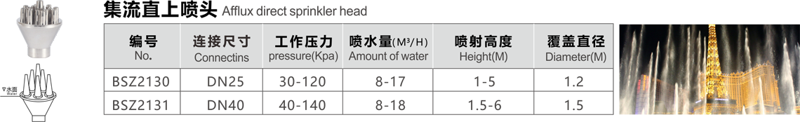 特點(diǎn):多個(gè)噴嘴組合噴射,射水時(shí)射流集中,粗壯高達(dá),氣勢宏偉,常用來作噴水池中心水柱的主噴頭。