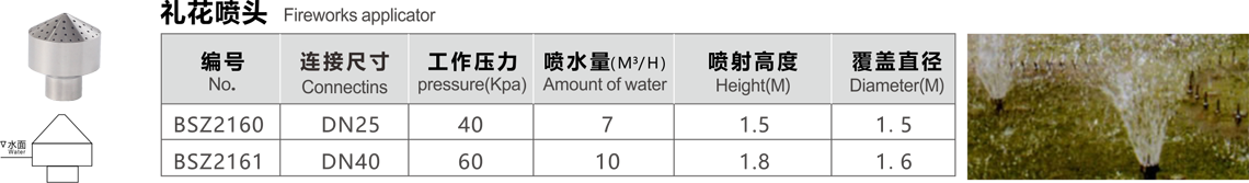 特點(diǎn):禮花噴頭是多孔散射噴頭的另一種,又稱蓮蓬噴頭。由于它與花柱噴頭的構(gòu)造稍有不同,噴出的水姿與花柱也有區(qū)別,它的噴水造型如正在燃放的禮花,造型美觀、安裝方便,適用于各種場合的噴水池中。