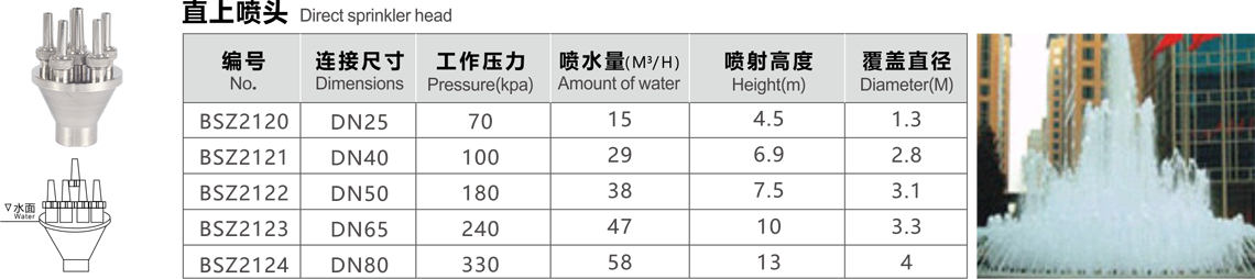 特點(diǎn):由中心直上和二圈不同層次的直流噴嘴組成,噴嘴形成中心水柱和兩層外向輻射的拋物線狀水花。
