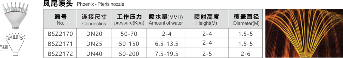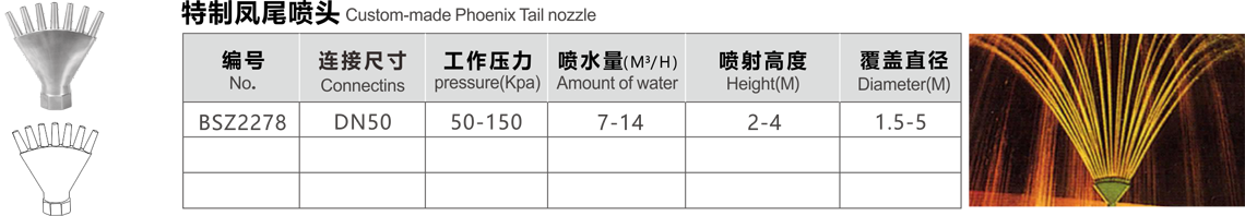 特點(diǎn):在一個(gè)配水室上,安裝一排可調(diào)帶閥小噴嘴.噴水造型如鳳尾,水流舒展柔媚.